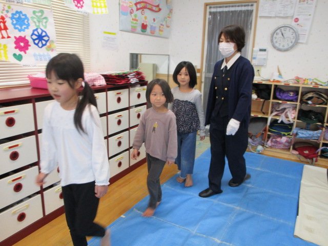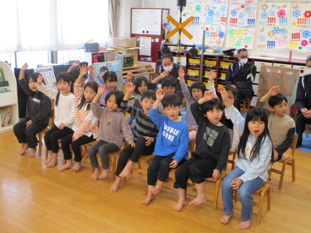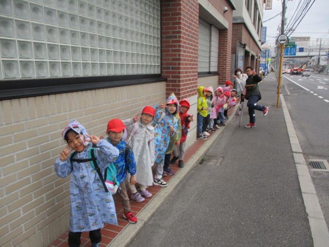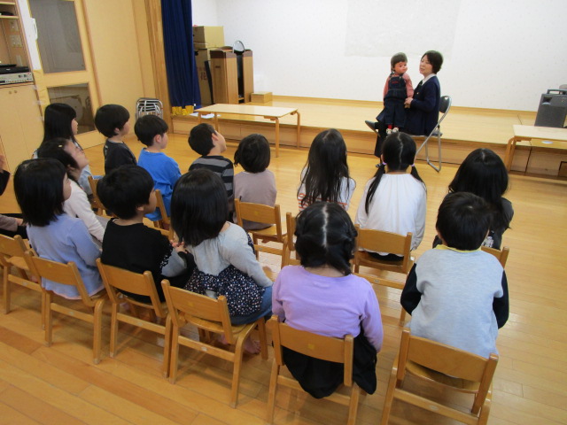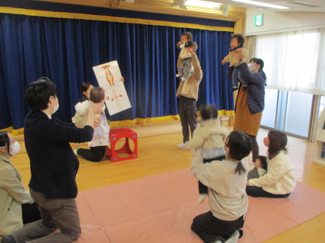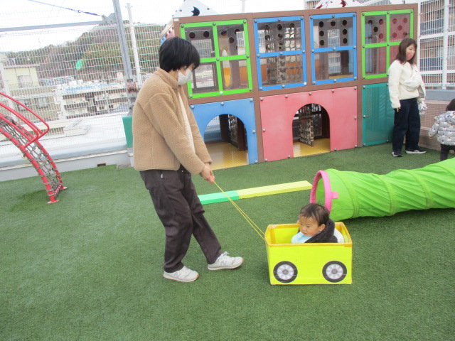 最初は遊戯室で朝の歌・季節の歌を歌ったり、大型絵本「ぴょーん」を観てから、屋上へ出発です(^^)/