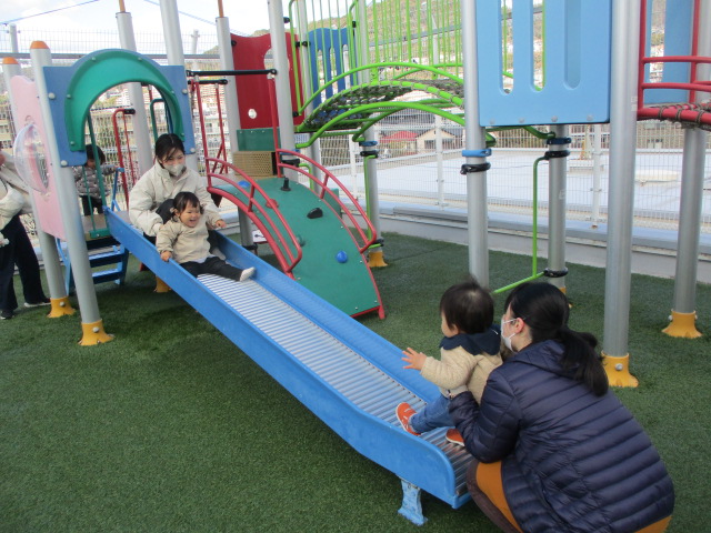滑り台を滑ったり、フープを並べてジャンプをしたり、トンネルを潜ったりと、開放的な空間で心地良さを感じながら元気に遊んでいました(^^)