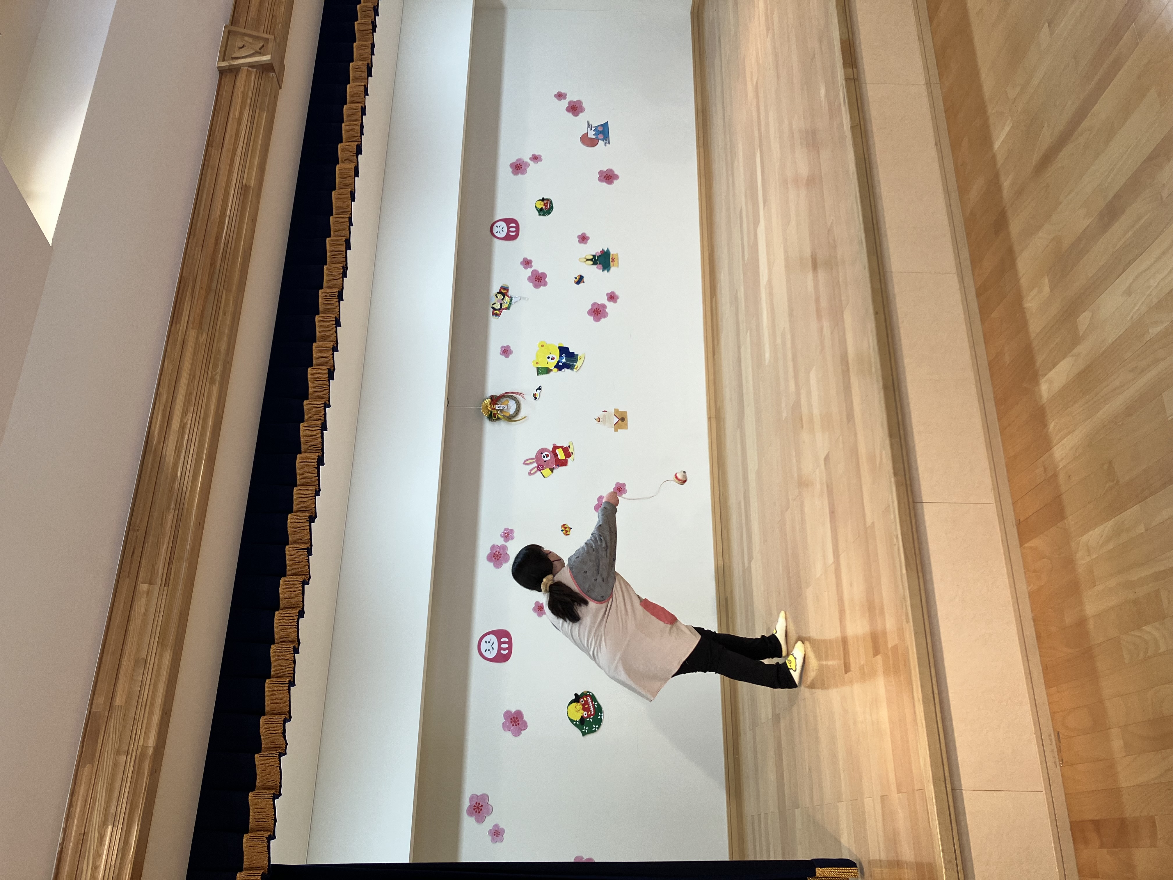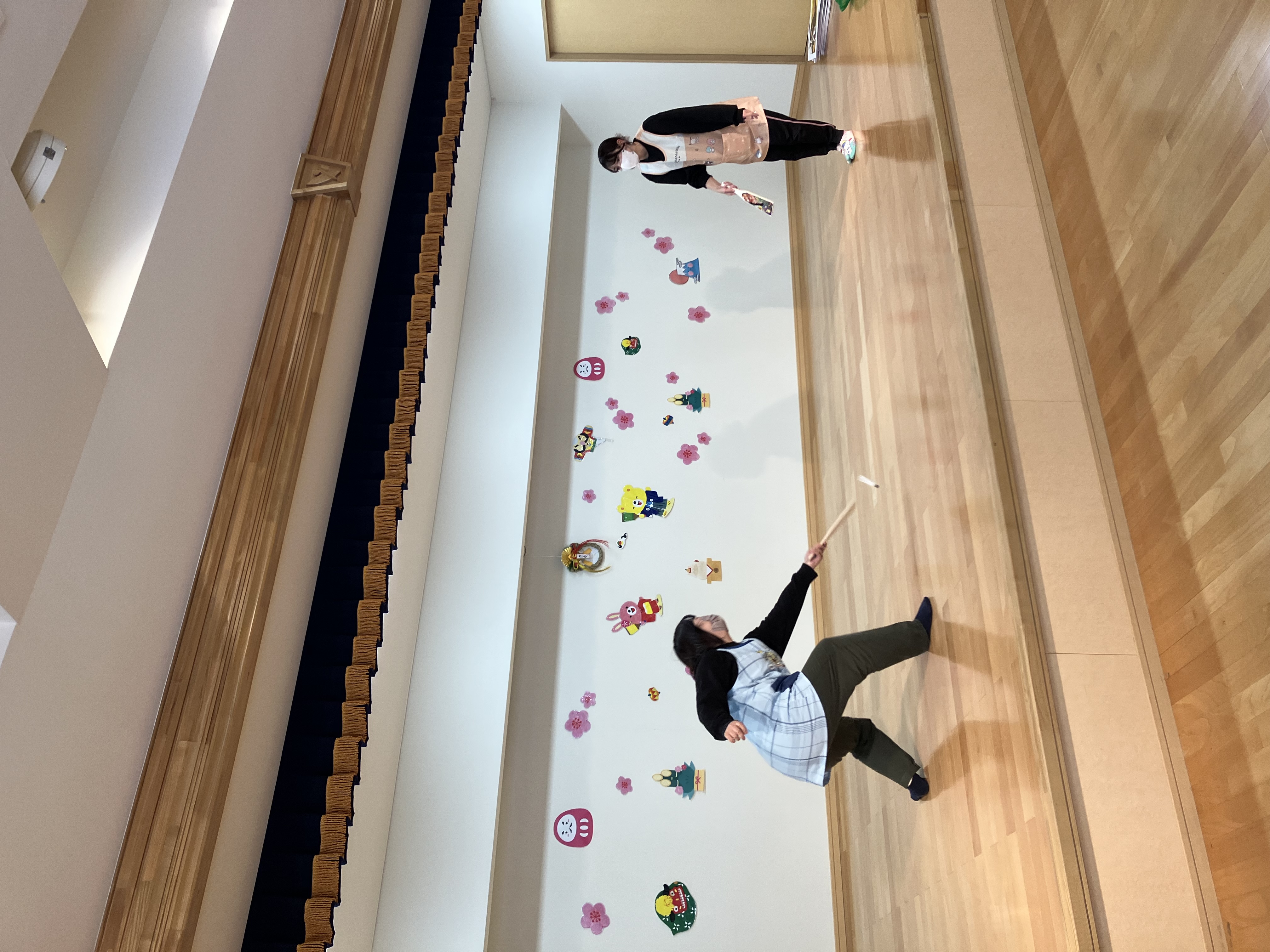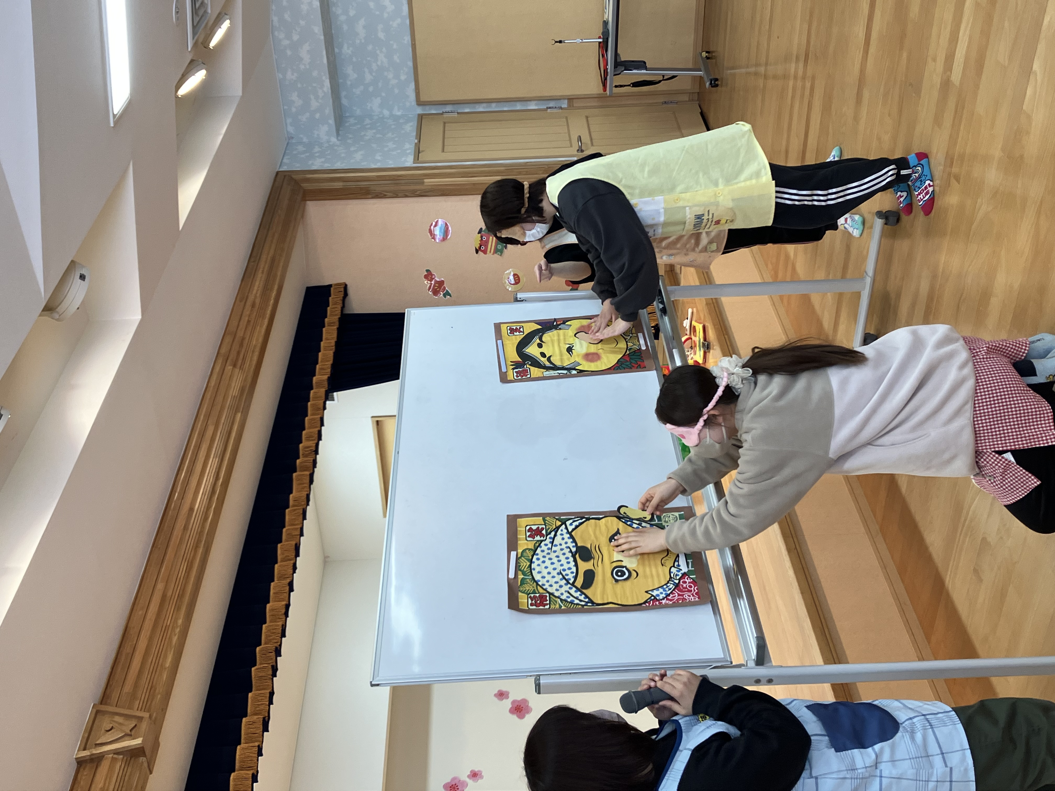 その後は、コマ回しや羽根つき、かるた、福笑いといった「お正月遊び」を紹介しました。