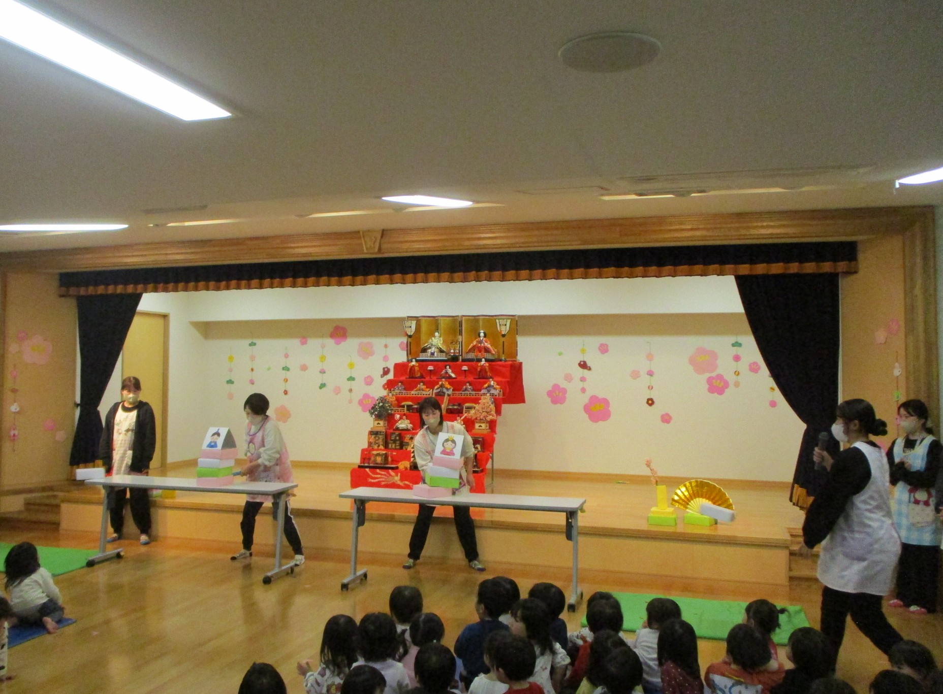 その後は、お話に出てきた内容に沿ったクイズを楽しんだり、各クラスのひな飾り製作を見て、