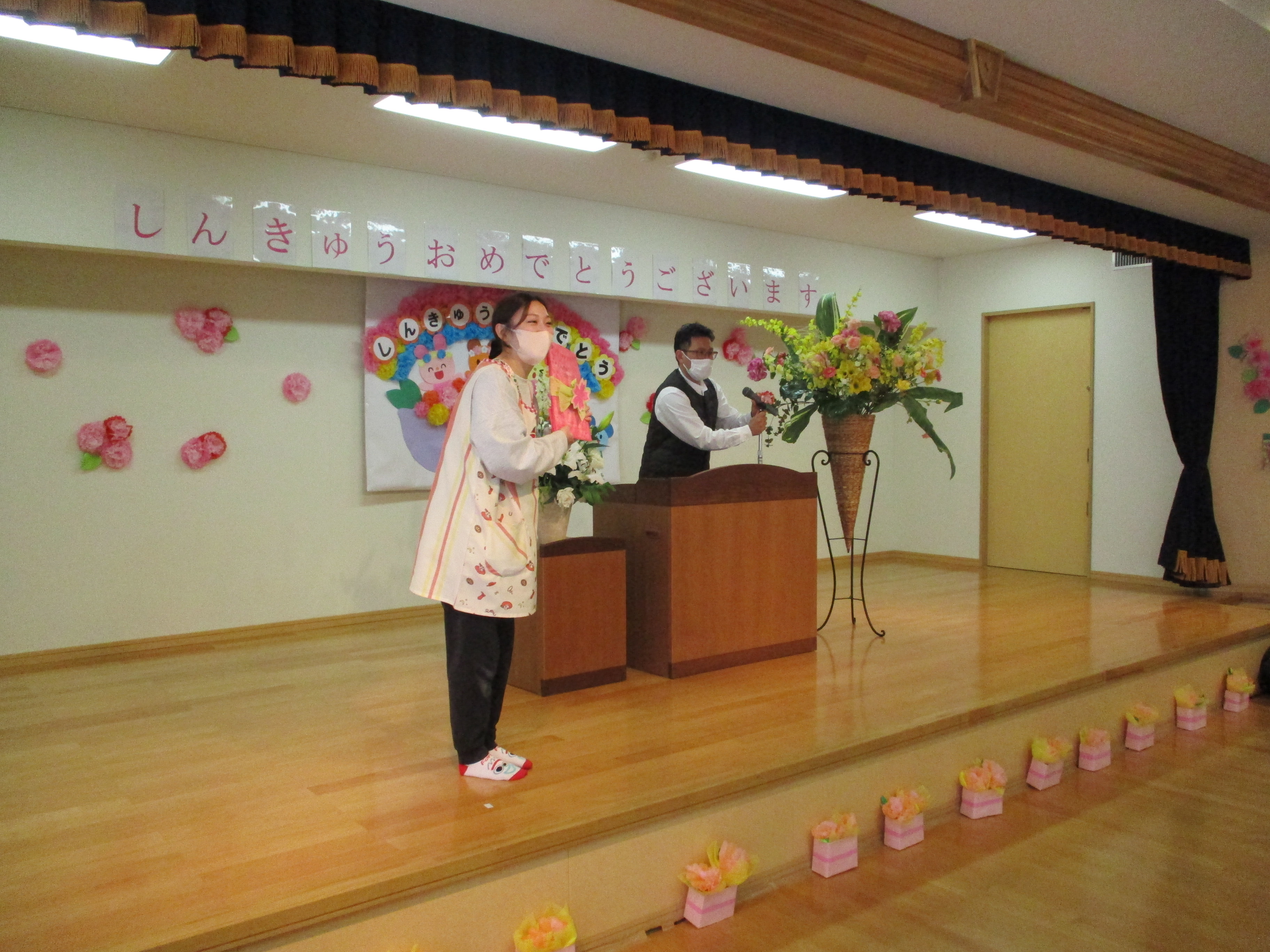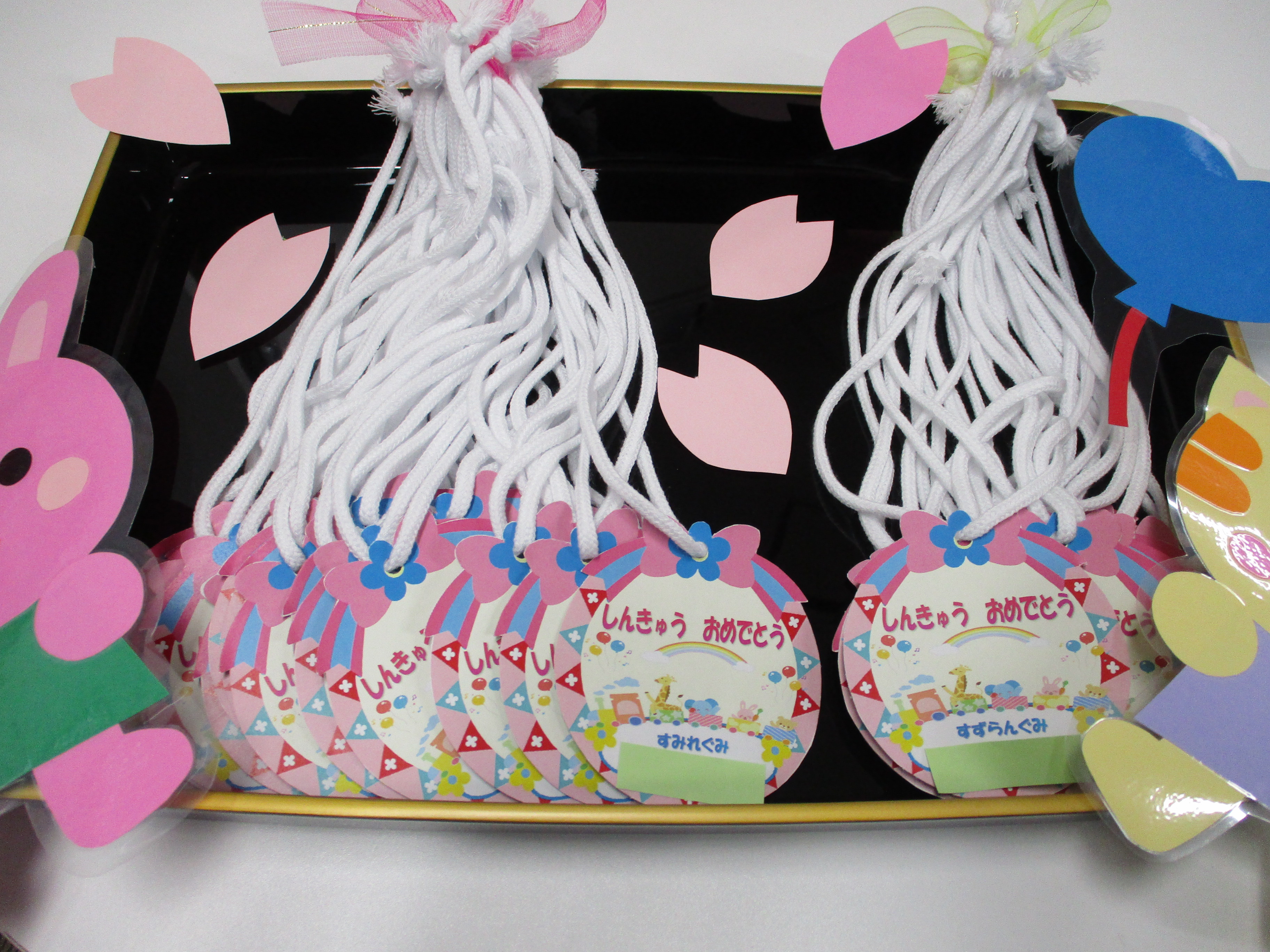 その後園長先生より、各クラスの担任へ2歳児クラスには「進級メダル」、幼児組には