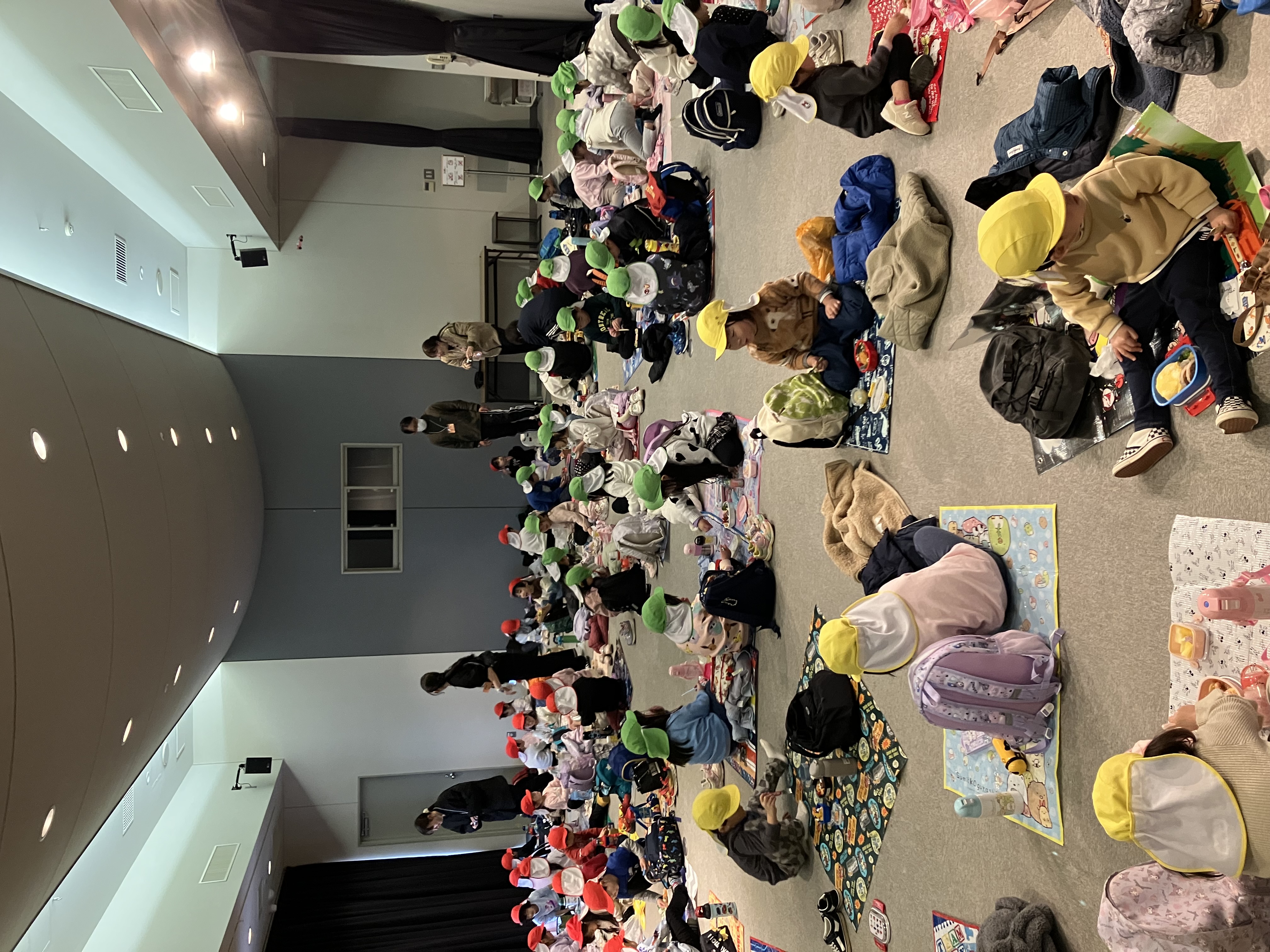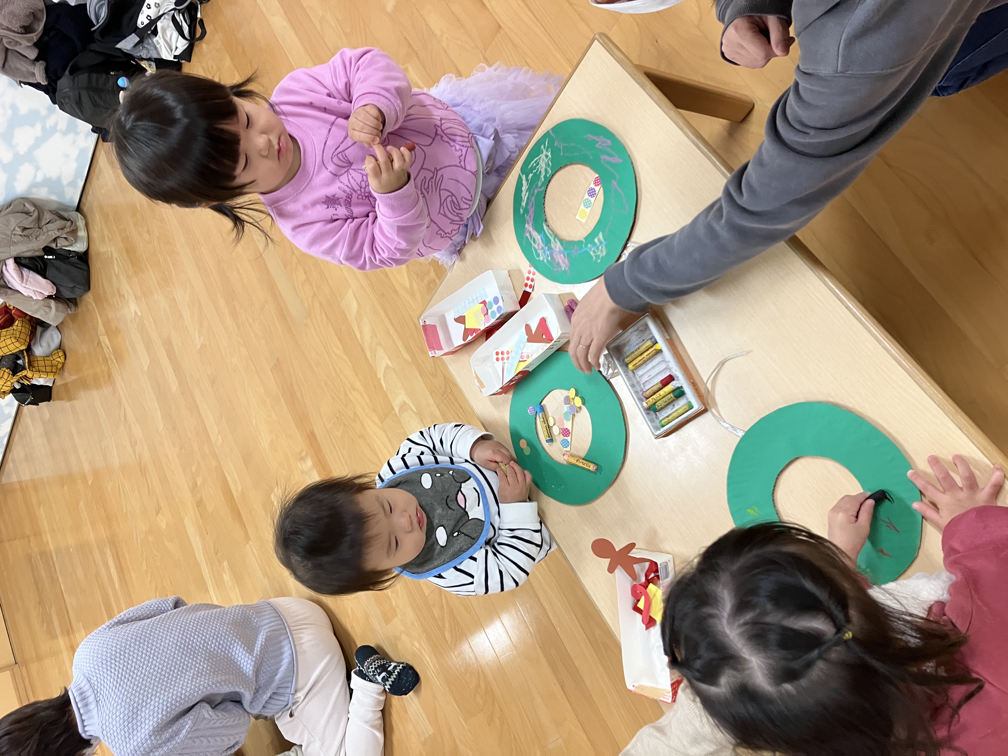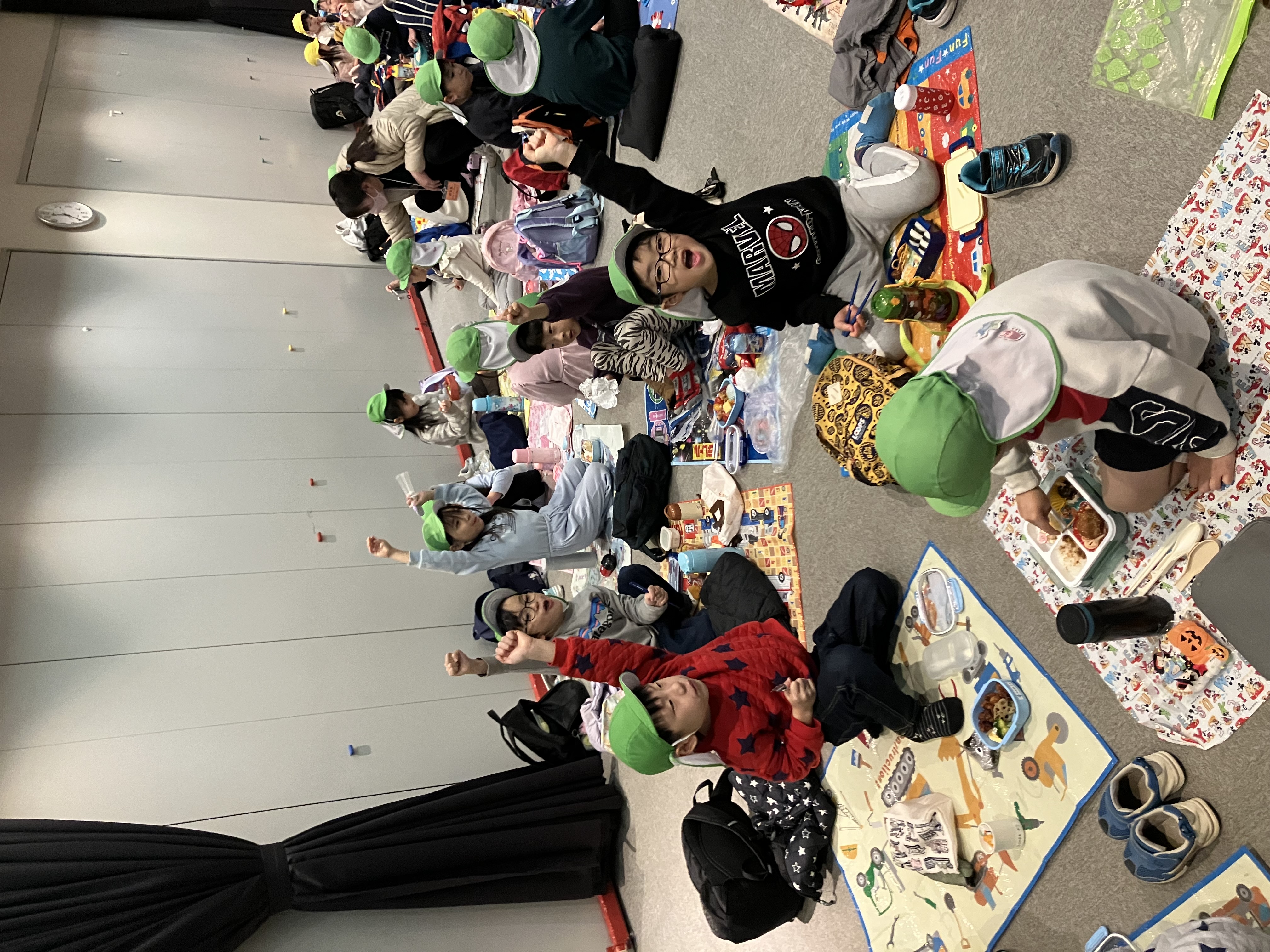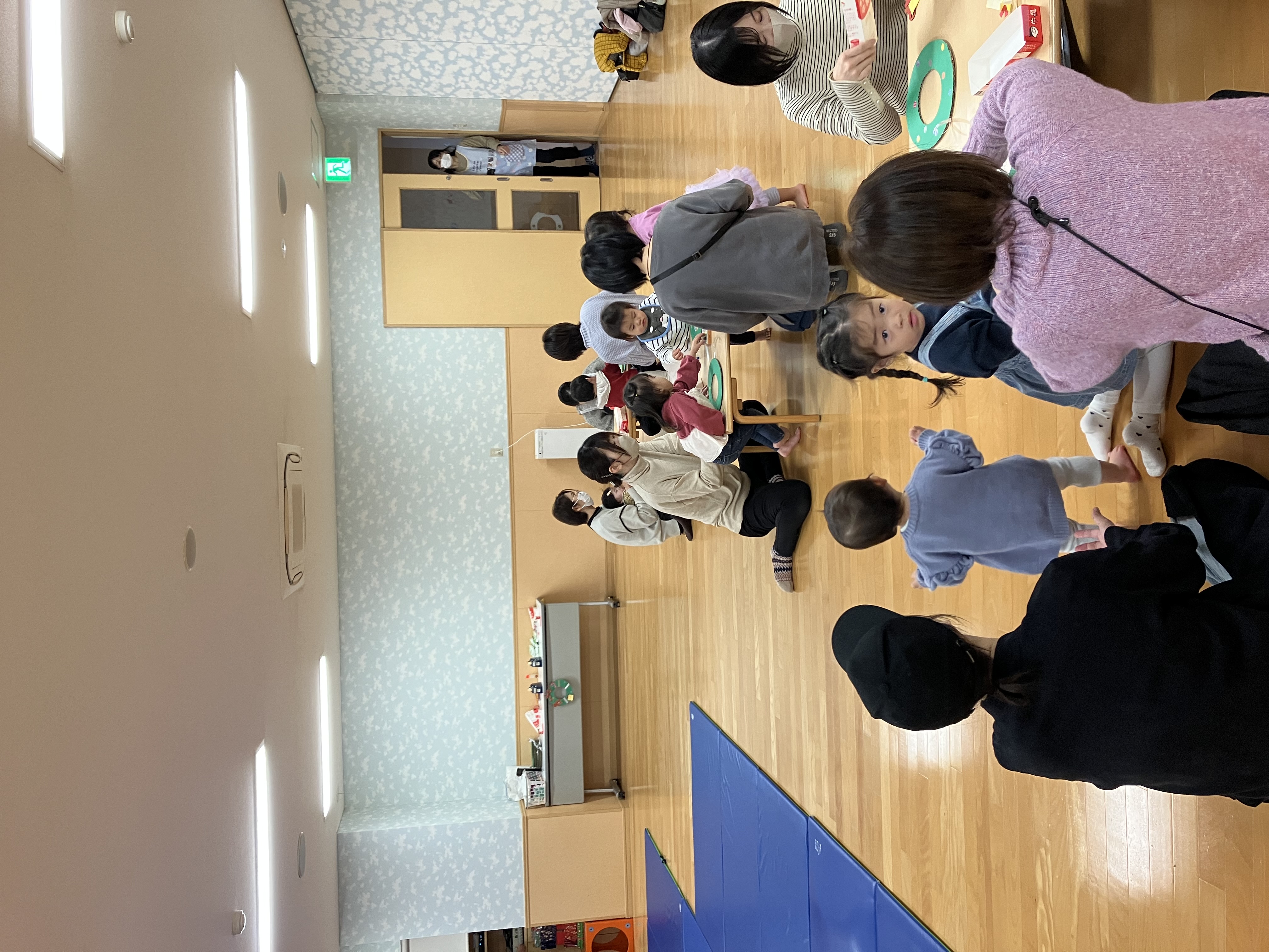 遊戯室へ行くと机に食べ物がずらーっと並んであり、「うわー!おいしそう♡」と目をキラキラさせている子ども達。