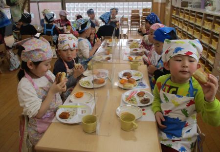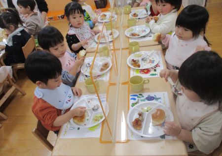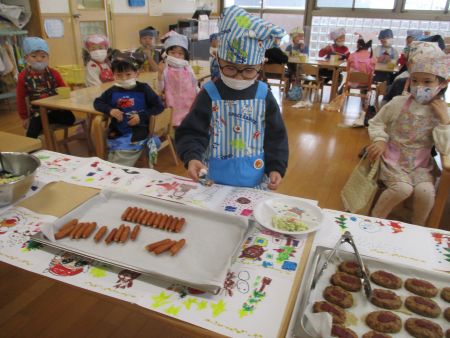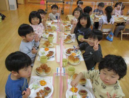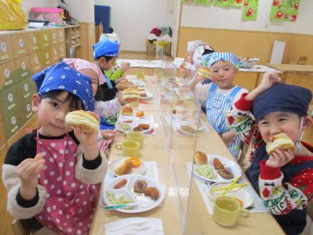 ハンバーグやウィンナー等、落とさないように取り皿に取って運び、席についてパンにはさんで・・・「できたよ!見て見て!」とうれしそうな子どもたちでした。
