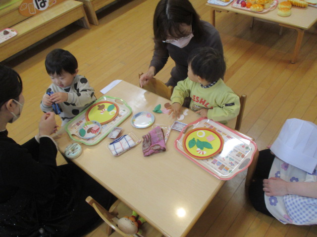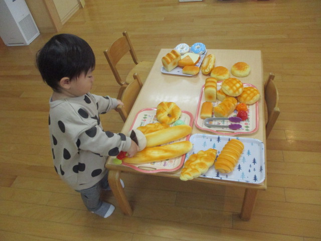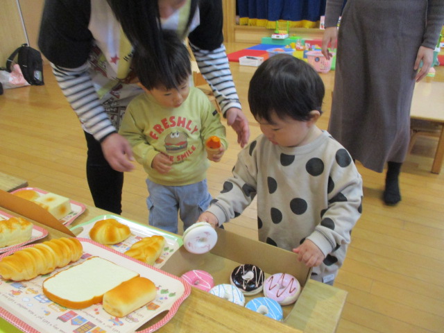 乳児用の絵本を持っていき、並べると手に取って観たり、保護者の方に読んでもらっていました。