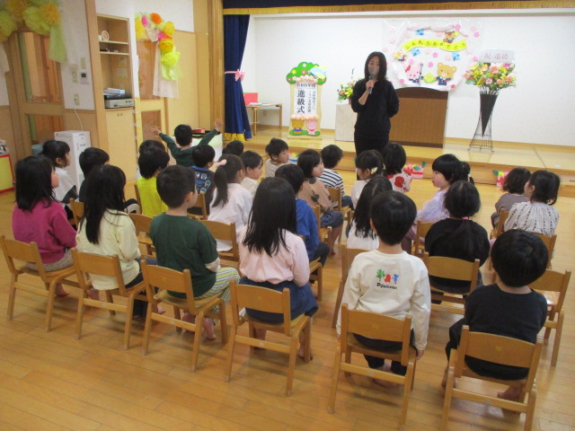 園長先生から進級についての話を聞いた後、進級証書の授与があり、5歳児クラスは一人一人氏名を呼ばれ、壇上で「ありがとうございます」とお礼を言って受け取る姿がとても素敵でした。