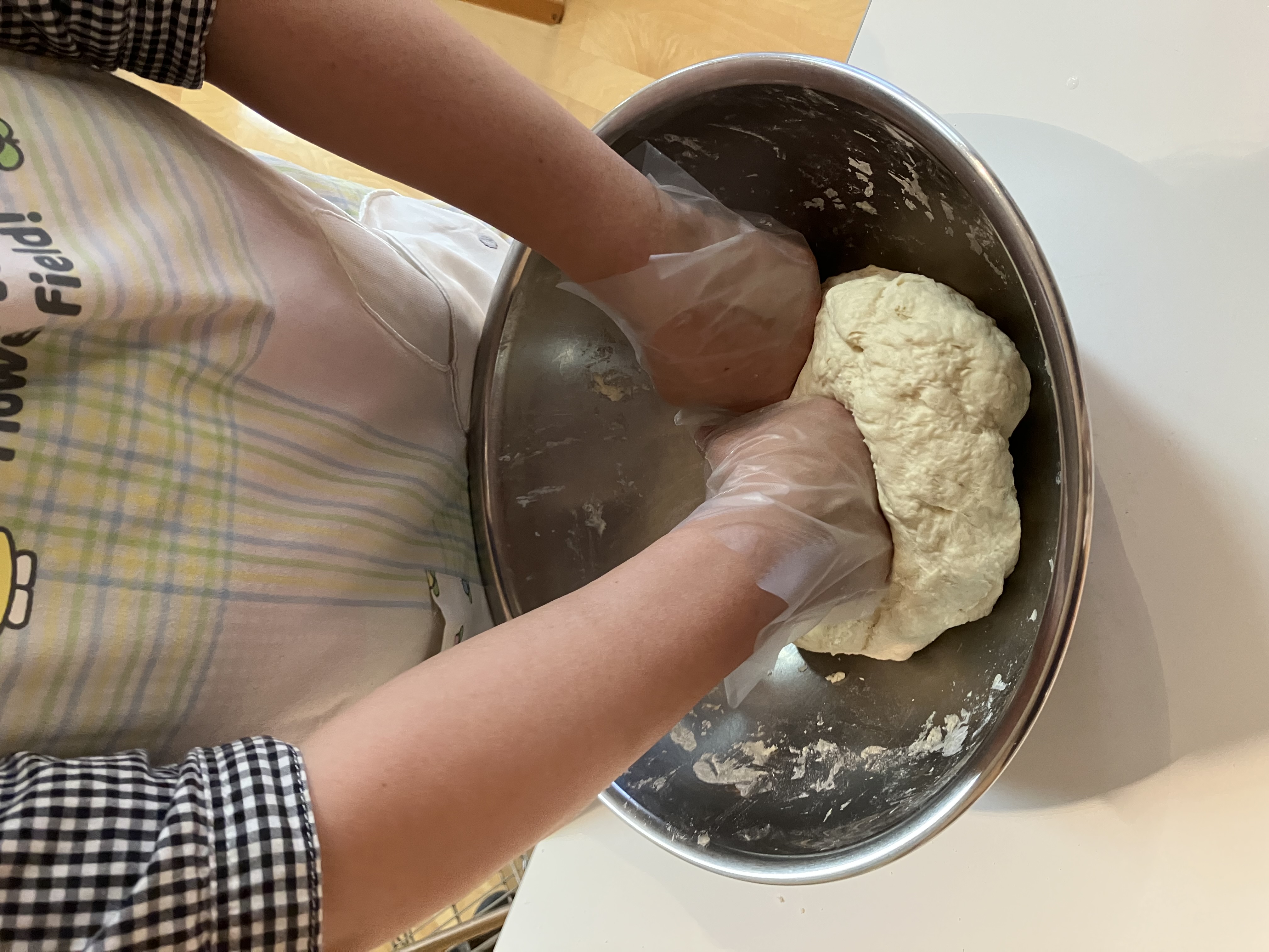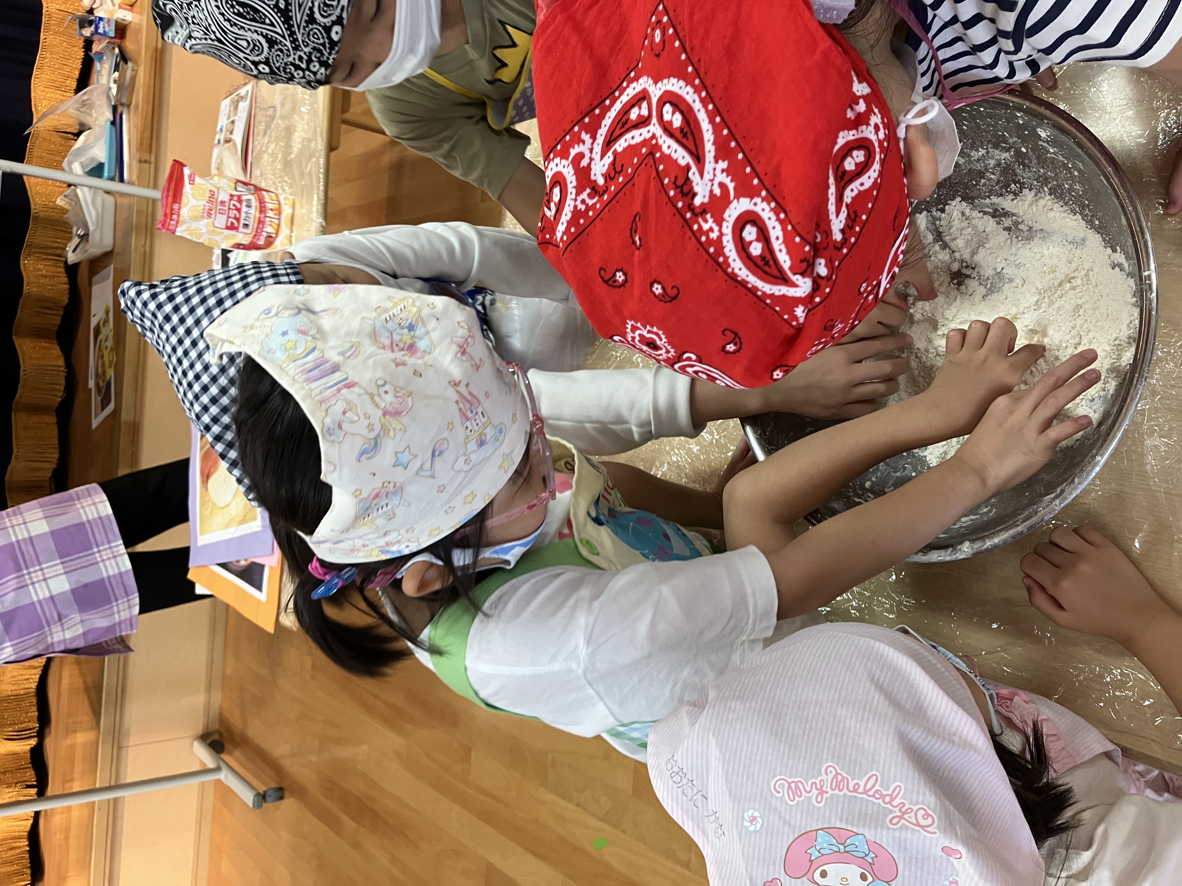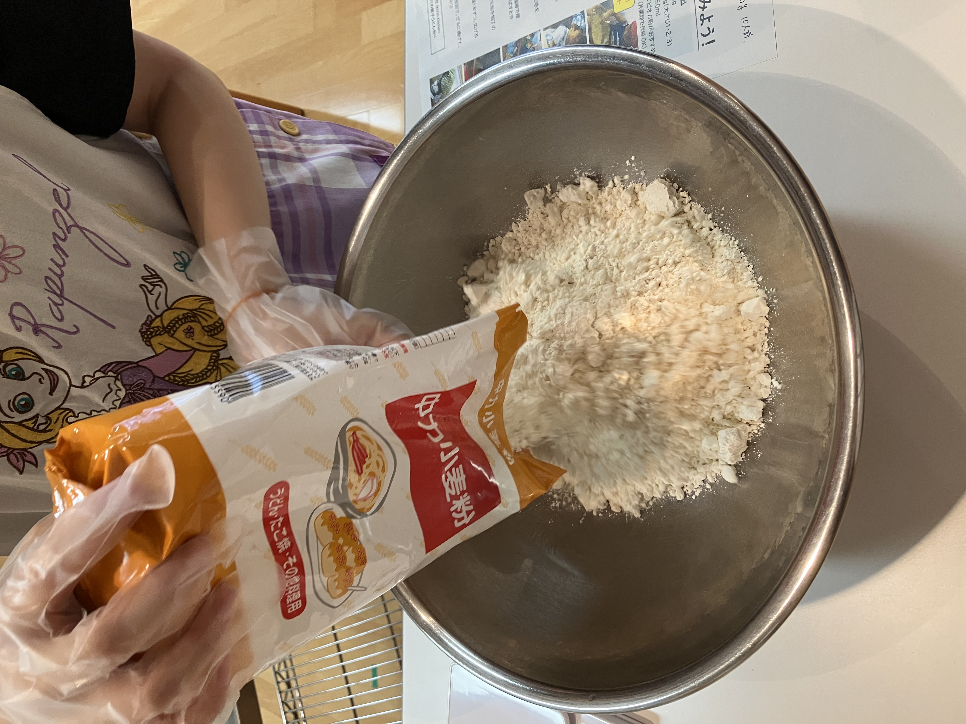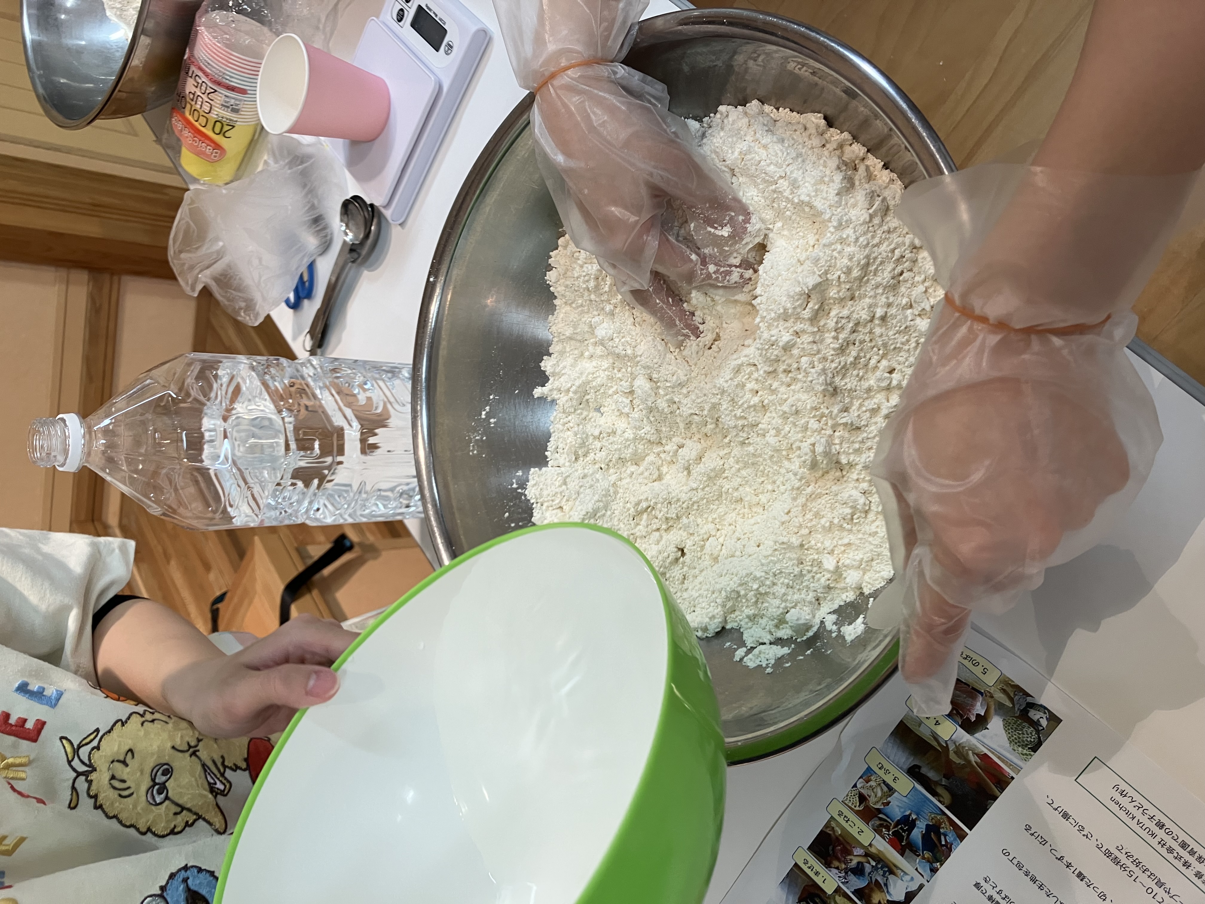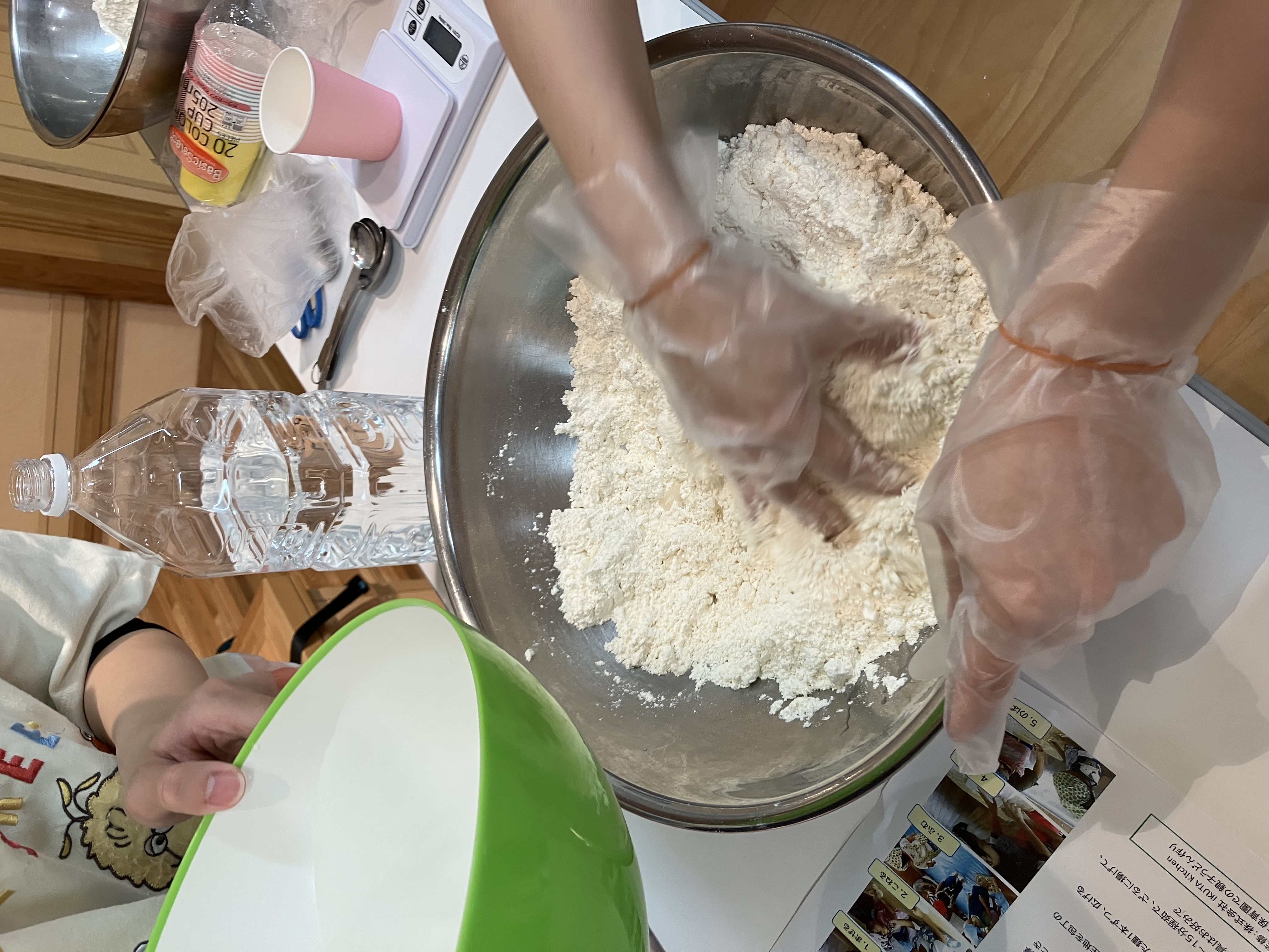 そして、小麦粉を触ったり、小麦粉と塩水を混ぜた生地を触って、感触の変化も楽しみましたよ♪