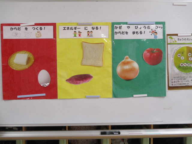 続いて、3色食品群のボードを使って食べ物に含まれる栄養について学び、どの食べ物が