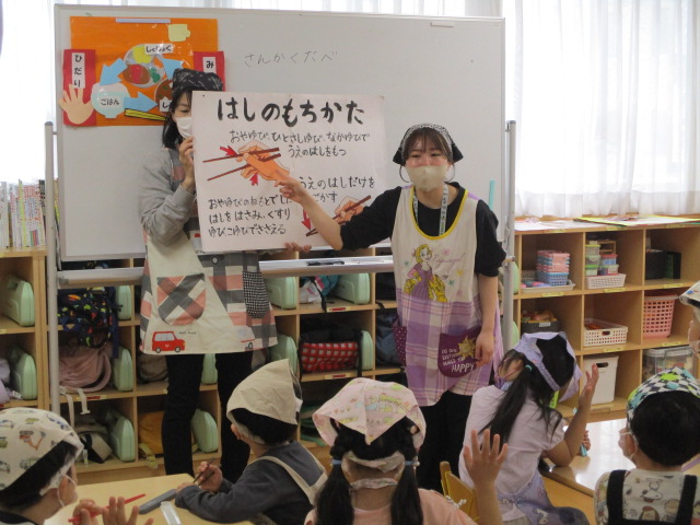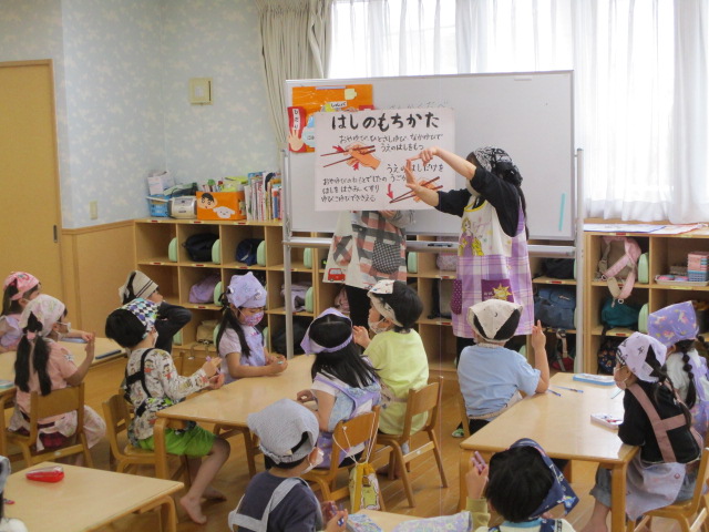 また、年長組は実際にお箸を持ちながらイラストを見ながら、改めて正し箸の持ち方も学びました。