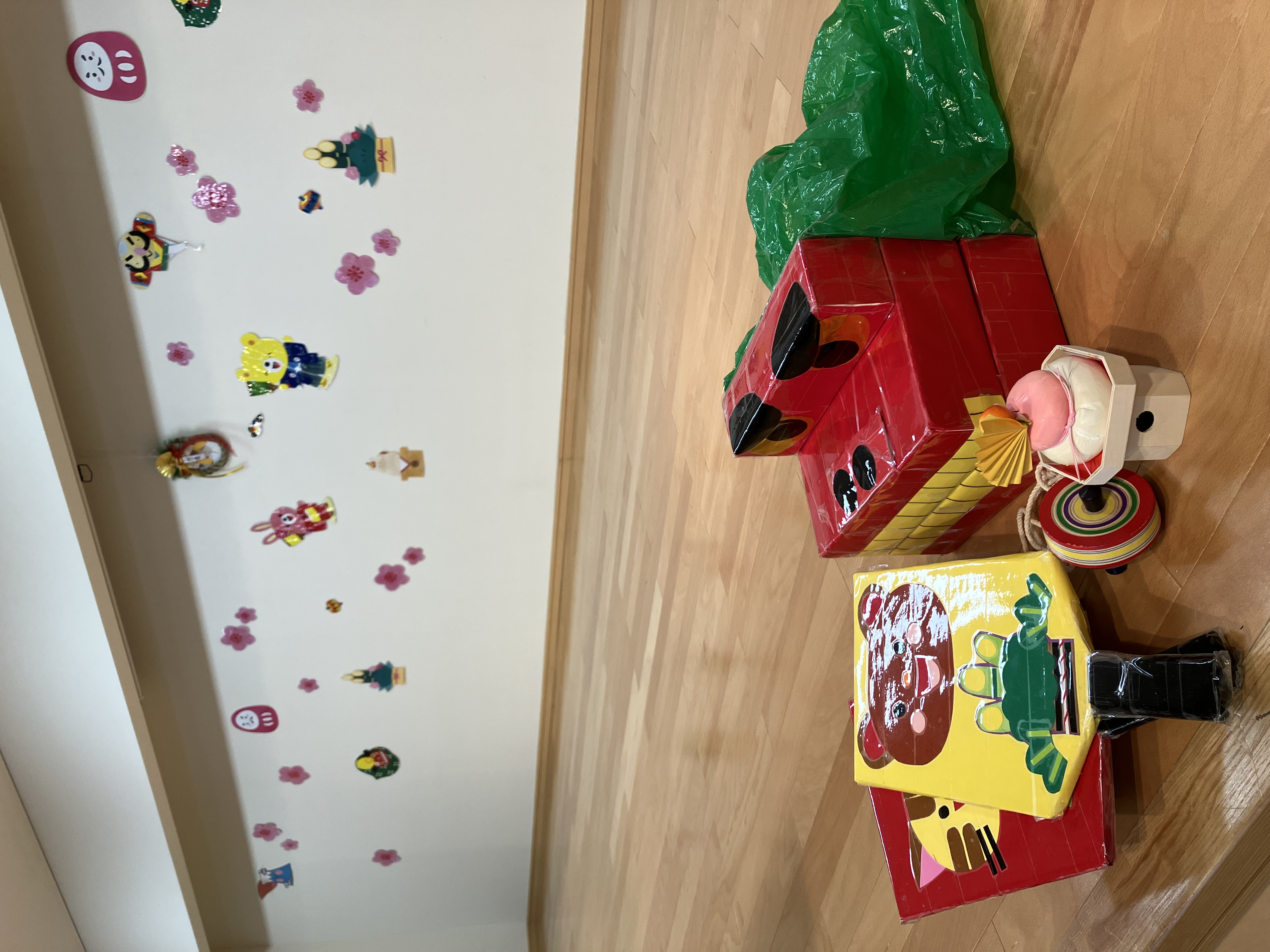 その後は、コマ回しや羽根つき、かるた、福笑いといった「お正月遊び」を紹介しました。
