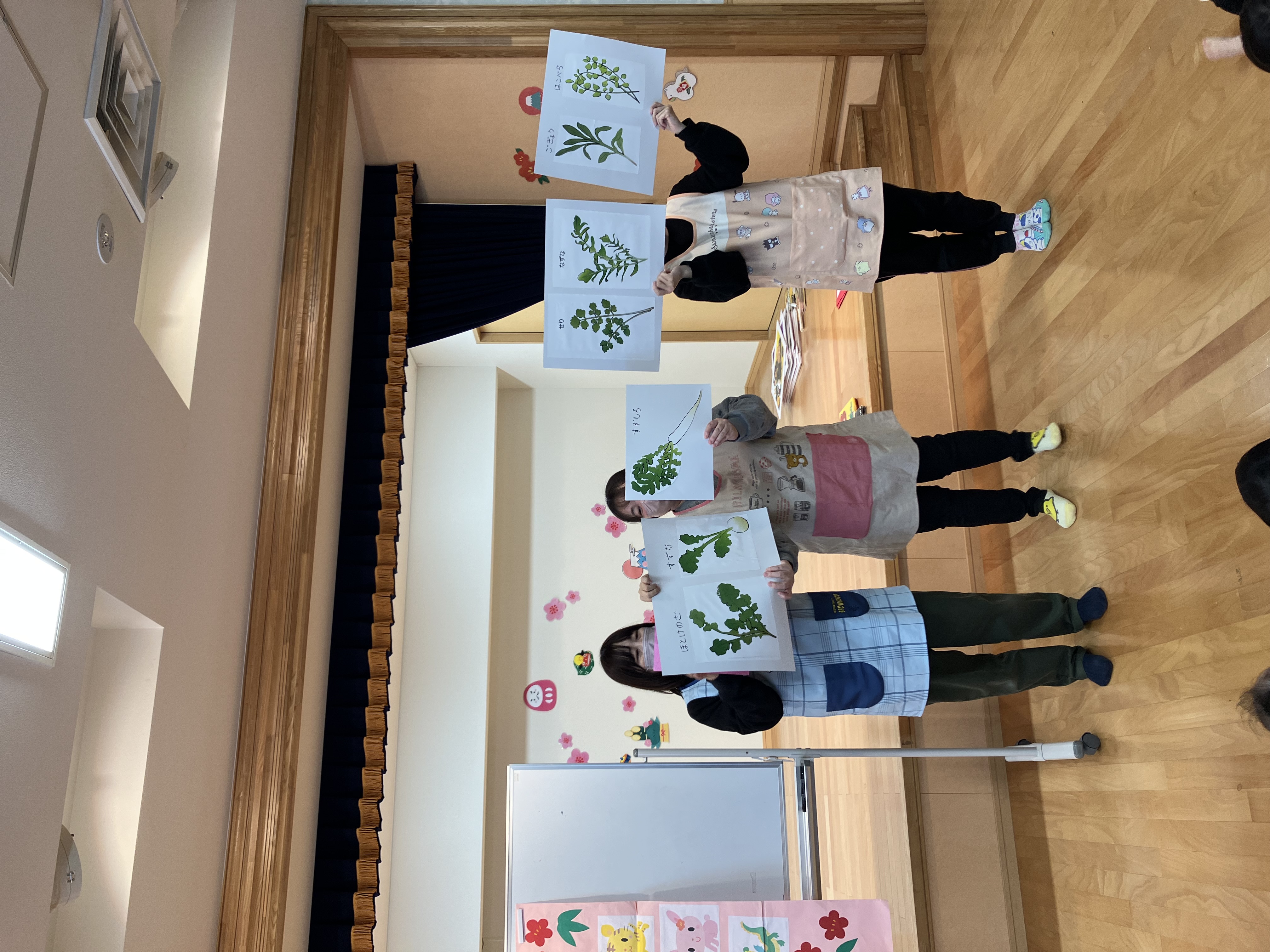 子どもたちは晴れやかな表情で集まり、日本の伝統行事に親しみながら、おせち料理や七草粥にまつわるお話を聞きました。
