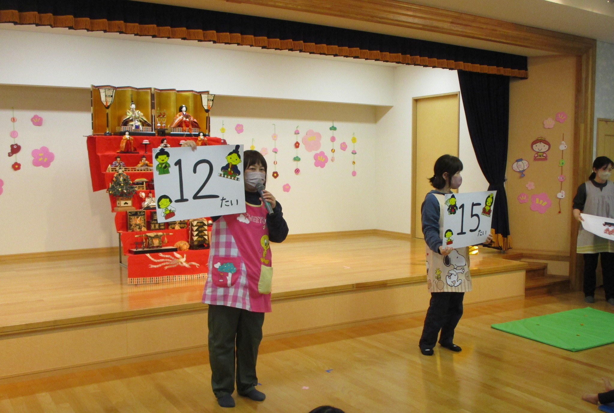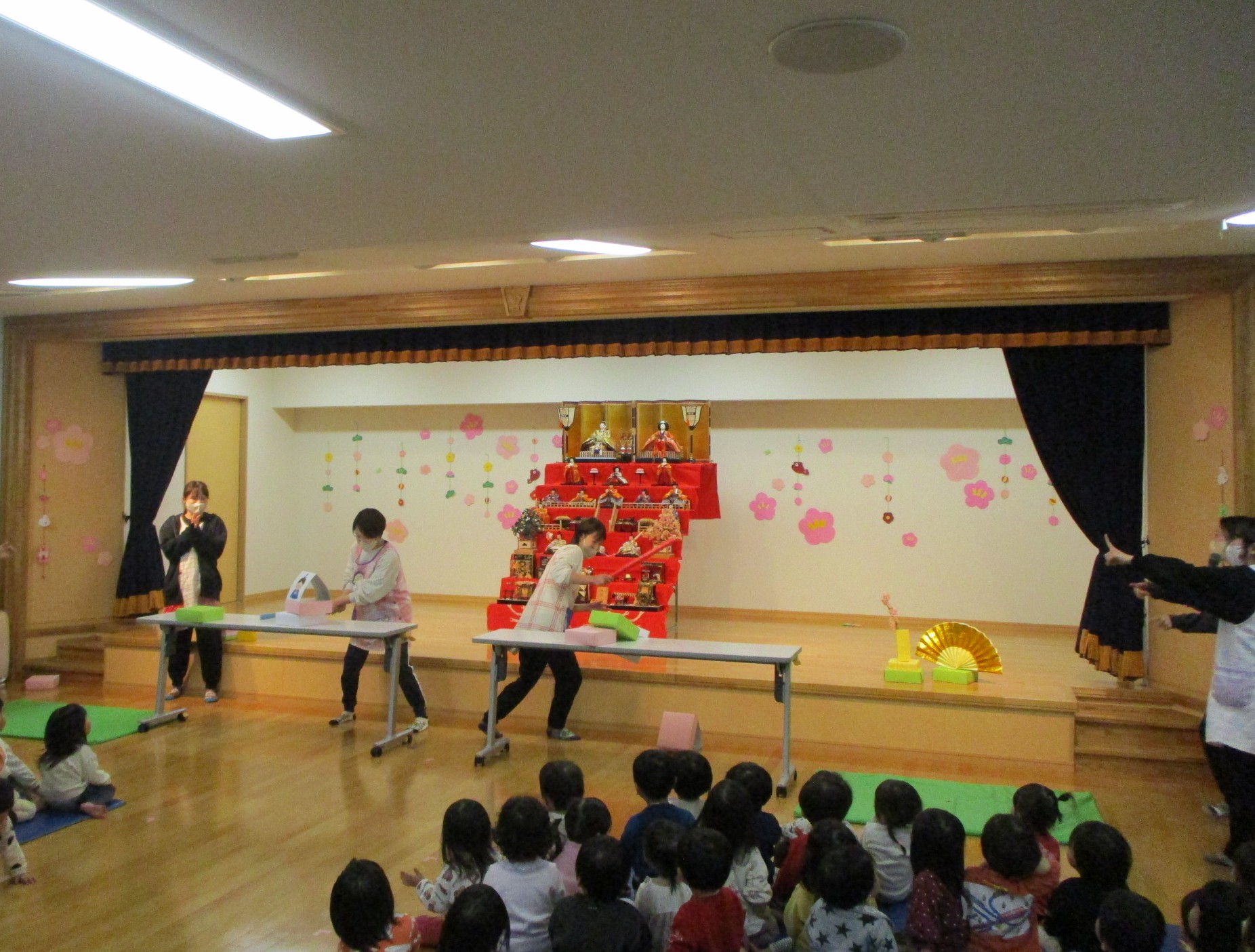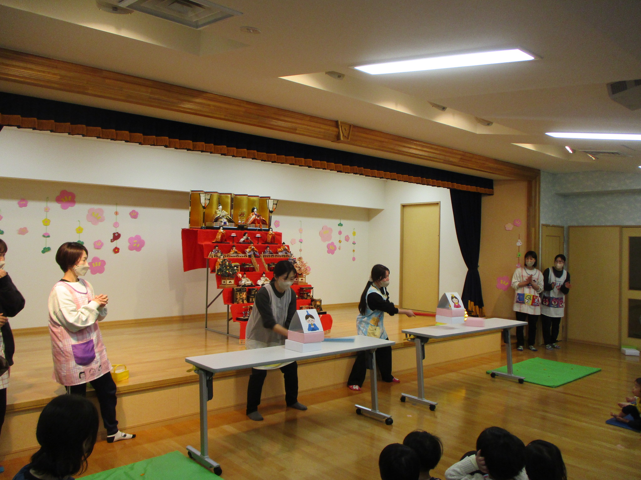 その後は、お話に出てきた内容に沿ったクイズを楽しんだり、各クラスのひな飾り製作を見て、