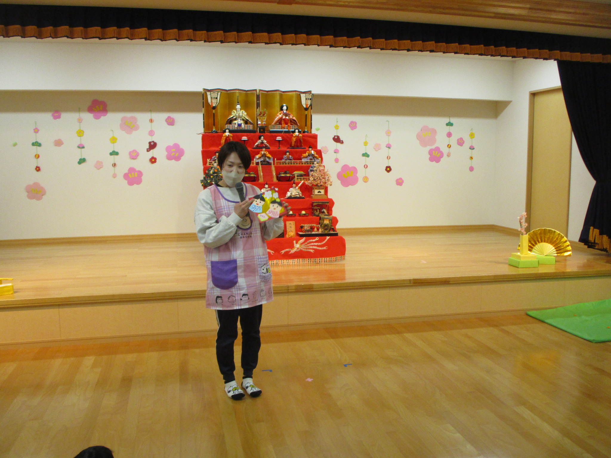 遊戯室に集まって、みんなで「ひな祭り会」に参加しました。