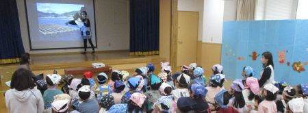 最初に遊戯室で名産食材についての映像を観ながらお話を聞きました。
