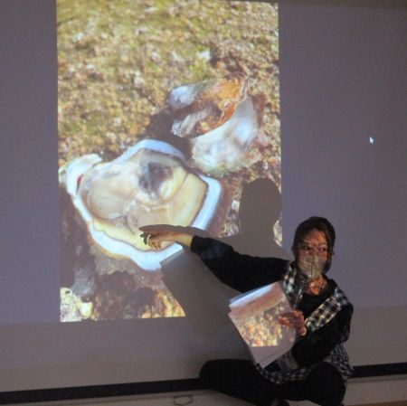 「牡蠣の殻」「くわい」を触って、「わあ~」興味津々でした。
