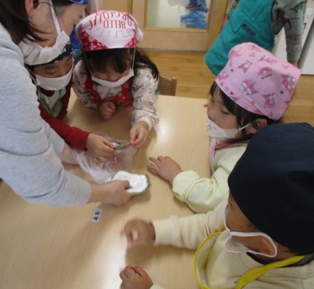 次に、各クラスに移動して、実際に食材を見たり触ったりしました。