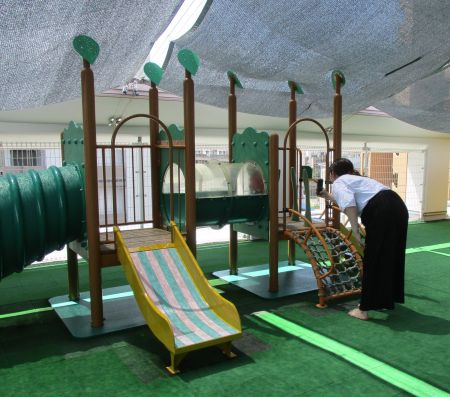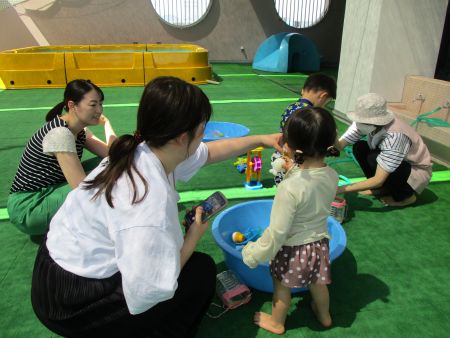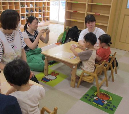 年長たけのこ組の子供たちが、はっぴを着てお店屋さんになり「いらっしゃい」「はいどうぞ!」「こうやって遊びますよ」と小さいおともだちに優しい声をかけていました。