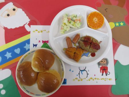 今日は、食育に向けてランチョンマット(クリスマスの絵を描きました)を作り、園児全員が敷いて食べました。