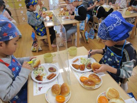 ハンバーグやウィンナー等、落とさないように取り皿に取って運び、席についてパンにはさんで・・・「できたよ!見て見て!」とうれしそうな子どもたちでした。