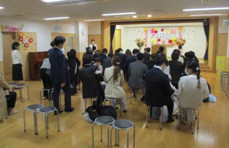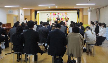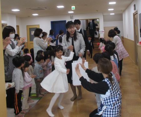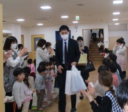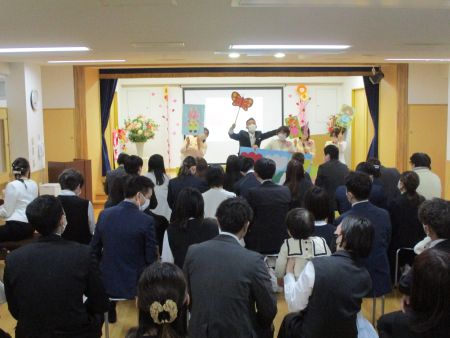 式では「園長挨拶」に続いて「職員紹介」・・・保育士がステージにいるのが見えるからか、新入園の子どもたちは保護者の方の膝に座り、じっと見入ったり、真似て拍手をしたりしていました☆