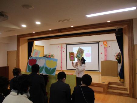 歓迎の出し物「保育園って楽しいな!」では、園生活の様子をプロジェクターで披露したり、チューリップの歌に合わせたペープサートを見て楽しみました。
