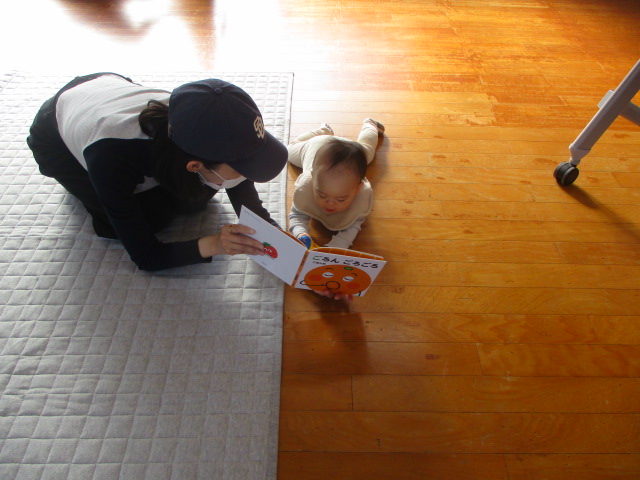 乳児用の絵本を持っていき、並べると手に取って観たり、保護者の方に読んでもらっていました。