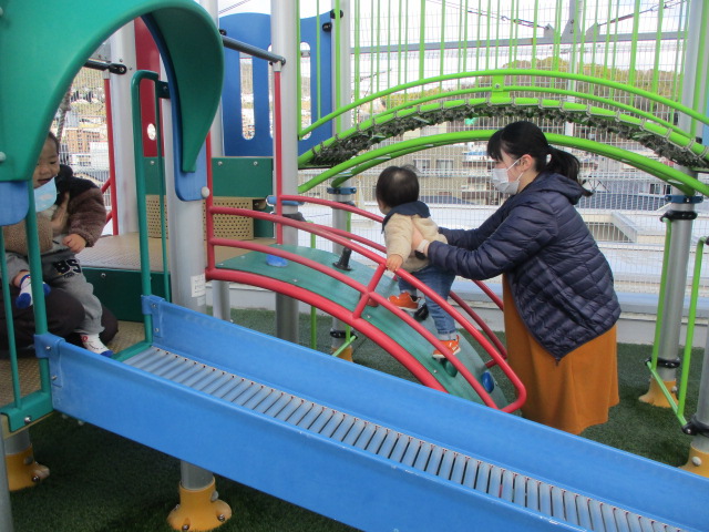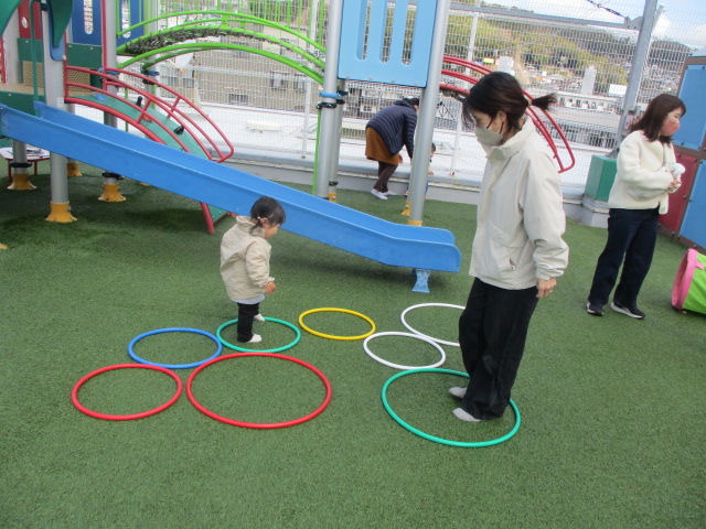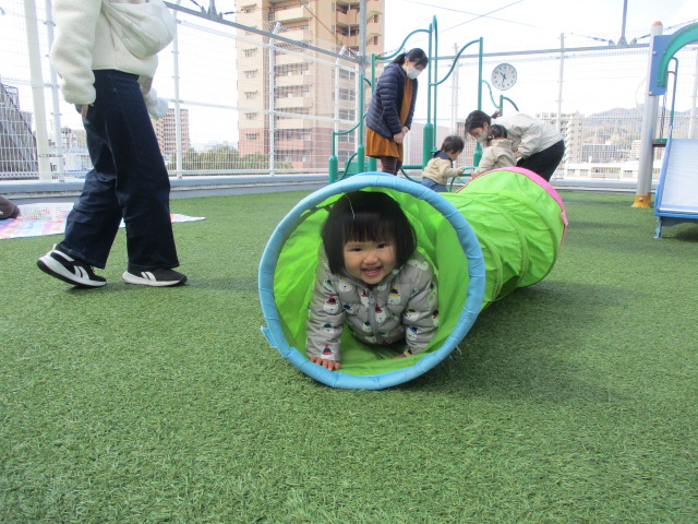 滑り台を滑ったり、フープを並べてジャンプをしたり、トンネルを潜ったりと、開放的な空間で心地良さを感じながら元気に遊んでいました(^^)