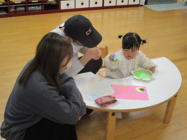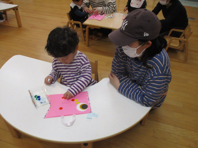 「あか!」と色の名前を言いながら一生懸命指先を動かしたり、「ぺたぺた!」「ぽんっ!」「ぎゅー‼」とリズミカルにスタンプをして楽しみ、可愛らしいこいのぼりの完成です(*^^*)