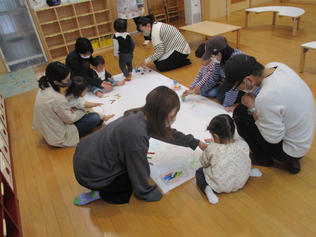 いろんな色を使ってなぐり描きをしたり、お家の方が描いた絵を指差して「らいおんさん!」と教えてくれたりと、とても和やかな時間となりました♡