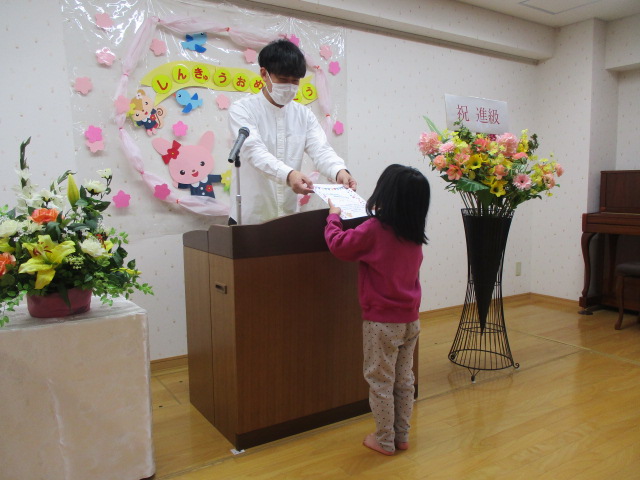 園長先生から進級についての話を聞いた後、進級証書の授与があり、5歳児クラスは一人一人氏名を呼ばれ、壇上で「ありがとうございます」とお礼を言って受け取る姿がとても素敵でした。