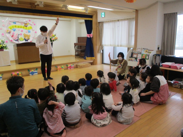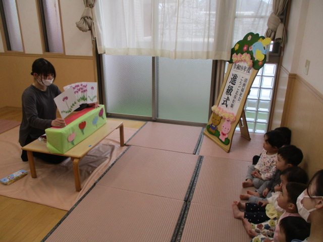 最後は保育士による進級をお祝いする出し物があり、春の花や虫が歌に合わせて登場してくる様子に夢中になっていましたよ(*^▽^*)